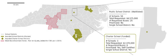 In 2022, funds were distributed across the EPA’s ten Regions, with Regions 4 and 5 leading in funded districts (Figure 2) [11]. Over 1900 applications sought nearly $4 billion, though awards prioritized districts meeting eligibility criteria based on National Center for Education Statistics (NCES) data. Notably, charter schools were allowed to apply as independent districts, broadening eligibility but also potentially diverting funds from larger public districts. For example, in North Carolina, individual charter schools with a few hundred students received funding over larger districts serving tens of thousands and areas with documented air quality concerns (Figure 3). This reveals a misalignment between funding awards and environmental health risks, partly due to differences in how air quality and school district boundaries are defined.