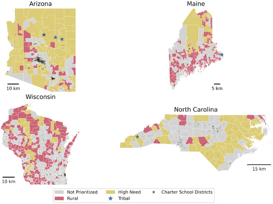 Distribution of Low-Income, Tribal, and Rural School Districts Across Four U.S. States. Data sourced from the U.S. Environmental Protection Agency (EPA) and National Center for Education Statistics Education Demographic and Geographic Estimates (NCES EDGE).