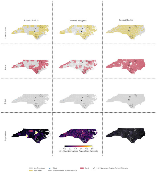 In the CSBRP context, the dasymetric method allows for a more accurate representation of where environmental justice needs are most pressing, ensuring that program outcomes are not an artifact of imprecise priorities or the geopolitics of school district designations within or across states. By refining the geographic boundaries of prioritization and incorporating complex data layers, dasymetric mapping enhances the accountability of the program’s implementation and supports more equitable policy outcomes [20,21,25,26]. The dasymetric mapping procedure followed a multi-step workflow (Figure 5). First, we defined the spatial extent of school districts and census blocks using NCES EDGE and TIGER/Line shapefiles. Next, we used National Land Cover Database (NLCD) 2021 [27] land cover data to identify and remove uninhabited areas (e.g., open water, forest, industrial zones). We then constructed Voronoi polygons centered on public and charter school locations using geographic coordinates. Population from school districts was then proportionally redistributed into intersecting census blocks and Voronoi polygons based on area overlap, using the Tobler package in PySAL. To estimate population coverage for each output unit, we performed spatial intersections and applied area-weighted interpolation, assigning higher weights to blocks or polygons with larger overlaps. All spatial operations were conducted in Python using GeoPandas and GRASS GIS for raster alignment.