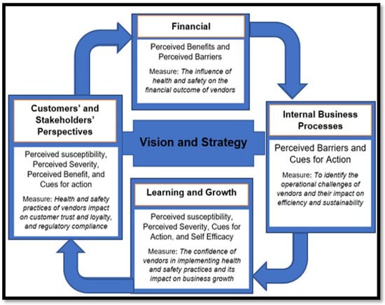 The BSC, originally developed for strategic performance management in organizations, provides a multi-dimensional lens for assessing systemic and institutional factors. It comprises four interlinked dimensions: (1) financial performance, (2) customer/stakeholder value, (3) internal processes, and (4) learning and growth (capacity building). Applied to informal food vending, the BSC enables the mapping of structural and policy-level influences that shape vendor environments, capacity, and sustainability []. The BSC framework was selected for its multidimensional lens, which complements the HBM by capturing operational, financial, and learning dimensions that are central to informal vendor ecosystems. Its inclusion enables the structured categorization of systemic and institutional factors affecting vendor compliance and health outcomes, elements that are often overlooked in behaviour-only models like the HBM.