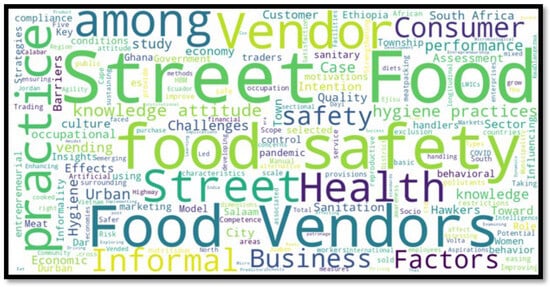 Prominent terms like “food”, “vendor”, “safety”, “hygiene”, and “street” dominated the visualization. These keywords confirm a heavy emphasis on public health concerns, particularly foodborne illness prevention, environmental sanitation, and personal hygiene practices among street food vendors. The frequent appearance of terms such as “urban”, “informal”, and “risk” further reinforces the relevance of socio-economic and structural factors that shape the operations of informal food vendors in low- and middle-income countries.