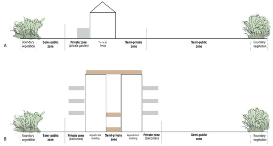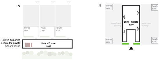 Allocation of the semi-private zones in terraced housing (A) and apartment buildings (B). Arrowheads indicate building entrances.