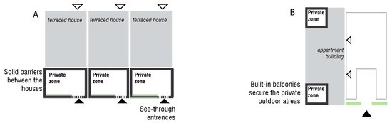 Allocation of the private zones in the terraced housing (A) and apartment housing (B). Arrowheads indicate building entrances.