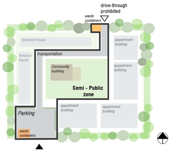Allocation of the semi-public zone on the property. Parking should be restricted to one location within the property to minimize the car fumes in the housing area. Arrowheads indicate property entrances.