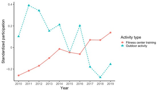 Trends in standardized participation in outdoor activity and fitness center training from 2010 to 2019. Lines represent the yearly average standardized score for self-reported engagement in outdoor activity (e.g., hiking, skiing, camping) and fitness center training (one item). Scores are based on z-transformed means per year, allowing comparison of relative change over time. Both activities show opposite trends, with outdoor activity decreasing and fitness center training increasing across the observed period.