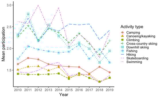 Trends in raw mean participation in specific outdoor activities from 2010 to 2019. The figure displays average reported engagement in nine types of outdoor recreation. Participation scores reflect raw item means per activity on a Likert scale, with higher values indicating more frequent participation. Each line represents the yearly average for one activity, with points marking annual means. Shaded areas are not shown; values are unadjusted and descriptive.