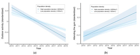Trends in physical activity from 2010 to 2019 by municipal population density. (a) Predicted levels of outdoor recreation over time, moderated by population density; (b) Predicted levels of fitness center training over time, moderated by population density. Shaded areas represent 95% confidence intervals. Population density was operationalized as residents per square kilometer and categorized as low (~55/km2) or high (~625/km2).