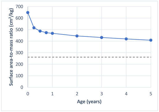 Surface area-to-mass ratio by age. The solid line shows the values calculated for children using the formula for body surface area by Mosteller [24] and child growth standards for height and weight by WHO [27]. The dashed line shows the average surface area-to-mass ratio for adults, based on values reported by Verbraecken et al. [28].