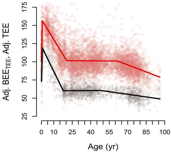 Size-adjusted total (red) and basal (black) energy expenditure over the life course. Energy expenditures are expressed as percentages of adult-level adjusted total energy expenditure (~100%). BEE: basal energy expenditure. TEE: total energy expenditure. From Pontzer et al., Daily energy expenditure through the human life course. Science 373, 808–812 (2021). Reprinted with permission from AAAS [37].