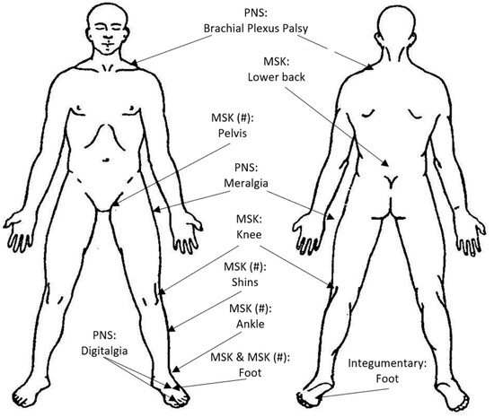 - Knapik, J.J.; Reynolds, K.; Orr, R.; Pope, R. Load carriage-related paresthesias: Part 1: Rucksack palsy and digitalgia paresthetica. J. Spec. Oper. Med. 2016, 16, 74–79. [Google Scholar] [CrossRef] [PubMed]