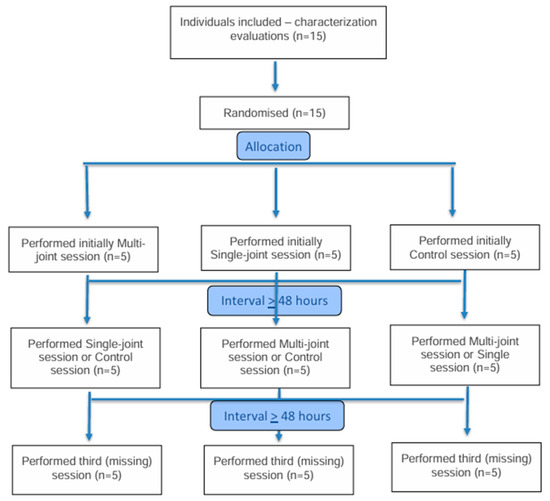 The order of the training sessions was randomized using the website www.randomizer.org (accessed on 24 June 2025) in a counterbalanced manner by a researcher not directly involved in the experimental procedures. Due to the nature of the study, blinding of the evaluators was not possible, as they were responsible for administering the intervention and collecting data in each session. Our randomization used blocks of 3 participants, applying three possible sequences until reaching the total sample of 15 participants. This approach ensured a balanced distribution, with an identical number of participants starting in each of the three session types, thereby minimizing any potential order effects.