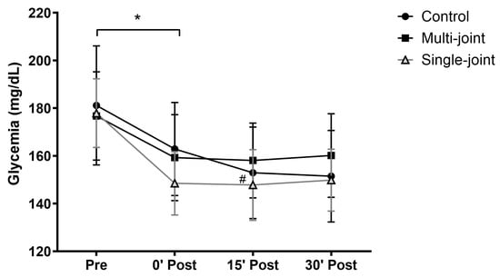 Glycemic levels Pre and 0 (0′ Post), 15 (15′ Post), and 30 (30′ Post) minutes after control (circle), multi-joint (square), and single-joint (triangle) sessions. * Difference between Pre and 0′ Post for all sessions; # 15′ Post different from 0′ Post only for control session. Values are presented as mean and standard error.