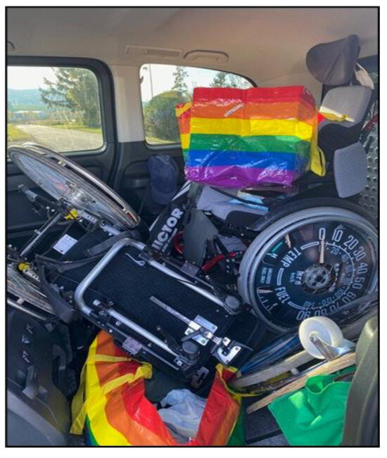 This theme highlighted the intricate balancing act that carers have to perform as they navigate the complexities of their responsibilities while striving to provide effective care. Mastering complexity describes the variety of challenges parents faces daily. Planning and structuring each day, providing personal care, and managing various appointments are constant components of their lives. Dealing with assistive devices is a central aspect of life and organization. These devices are perceived as both a support and a necessity for providing appropriate care. Family caregivers need to adapt to the use of technology and devices and integrate them into their daily lives. While Mrs. Pichler and other participants discussed the effort required to transport wheelchairs and accessories (Figure 1), Mrs. Holzer talked about the home ventilator her son depended on (Figure 2). The challenges are highly specific and individual, depending on the requirements and needs of their children.