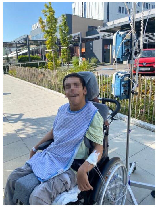 Sebastian in his wheelchair in front of the hospital (Mrs. Pichler, 51).