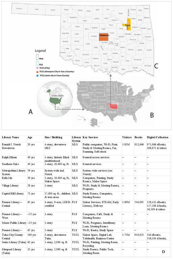 (A) US in World map; (B) Oklahoma in US map; (C) Oklahoma County and Tulsa County in Oklahoma State; (D) Library Snapshot. Source: The author interpreted all maps and snapshots based on data from the Oklahoma Department of Libraries Statistics (oklahoma.gov) [82].