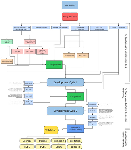 A multi-step process involving stakeholder engagement, systematic reviews, and iterative co-design cycles was undertaken to ensure contextual relevance and theoretical fidelity, thus improving the acceptability and feasibility of a training program that sought to engage a ‘hard to reach’ (ref) population group. This development cycle for the training is outlined in Figure 1. An initial draft of the training program was developed based upon a review of existing evidence, the outcomes from focus groups conducted with industry stakeholders [32] and the co-design exploration and development of TPB components around each of the mental health outcomes being targeted (mental health and suicide literacy, mental health and suicide stigma, and help seeking behaviors. These workshops were conducted at two key stages: during the initial development phase (R1) and after a draft intervention had been created (R2), allowing for more refined discussion, critique, and improvement of the program. The co-design workshops created an inclusive space where construction workers from different trades could participate equally with mental health professionals, intervention facilitators, and the researchers developing the intervention. The evaluation will be integrated into the pilot training delivery in the form of a pre- and post-intervention quasi-experimental study to assess the initial validity of the intervention. The set of validated instruments will include the Literacy of Suicide Scale (LOSS) to measure mental health literacy, the Stigma of Suicide Scale (SOSS) to assess stigma, and the General Help-Seeking Questionnaire (GHSQ) to evaluate help-seeking intentions. Consent from each participant was obtained, and data was collected pre- and post-intervention to gauge changes in the key outcomes. The integration of each theoretical underpinning is explored through the MRC framework below. Ethical approval was granted by South East Technological University’s ethics committee (Reference Number #313).