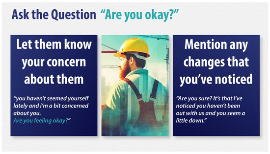 - King, T.L.; Batterham, P.J.; Lingard, H.; Gullestrup, J.; Lockwood, C.; Harvey, S.B.; Kelly, B.; LaMontagne, A.D.; Milner, A. Are young men getting the message? age differences in suicide prevention literacy among male construction workers. Environ. Res. Public Health 2019, 16, 475. [Google Scholar] [CrossRef]