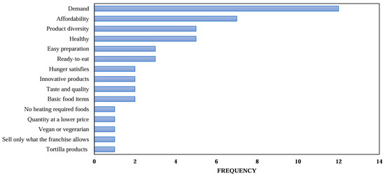 The primary determinant influencing food supply was student demand, as consumer preferences directly affect the availability of food and beverages. Similarly, economic access—both for the managers, who consider sourcing costs, and for the students, based on product prices—was a key factor in decision-making. Another relevant factor was the diversity of offerings; a broader variety of products was viewed as increasing sales opportunities. Interviewees also expressed interest in offering healthy food options, although this was not always prioritized in product selection. Less frequently, managers highlighted practicality as a criterion, favoring ingredients that can be used in multiple preparations and enable quick preparation, including both ready-to-eat and ready-to-sell products. Additional considerations include taste, satiety, perceived quality, product innovation, and the availability of basic and traditional options. Other criteria involved preferences for foods and beverages that do not require heating, the ratio of quantity to price, and the inclusion of tortilla-based products or items easily prepared on-site. Notably, only one establishment offered specific products for vegetarian or vegan consumers.