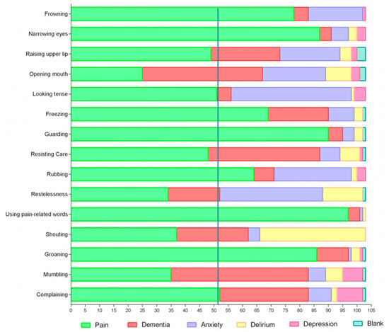 Number of participants who perceived the items of PAIC-15 as specific for pain in cognitive impairment or specific for other conditions such as dementia, anxiety, delirium, or depression. The blue line represents 50% of the participant’s responses.