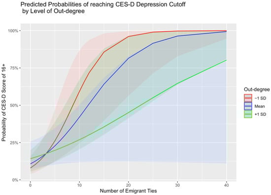 The predicted probabilities of falling above the threshold for symptoms of major depression associated with the number of emigrant ties at the mean level and +/−1 standard deviation of the out-degree, with 95% confidence intervals.