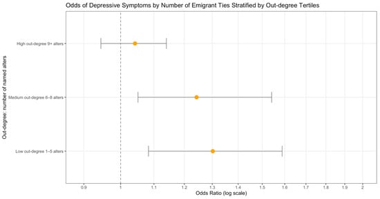 Further investigation of the relationship between the out-degree and depression yielded significance for an interaction with the out-degree. Stratification into subgroups by the out-degree suggested that those with higher numbers of emigrant ties are still more likely to be depressed than their peers with fewer or none, but the odds of depression are lower for those in the high out-degree subgroup, even with increasing numbers of emigrant ties. This may indicate that those with more emigrant ties still have higher odds of experiencing depression, but individuals with bigger social networks at home may reduce their odds of depression.