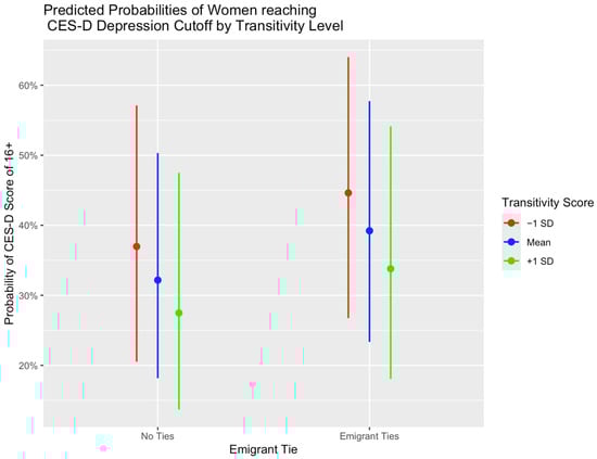 The predicted probabilities of falling above the threshold for symptoms of major depression for females with and without emigrant ties at the mean and +/−1 standard deviation of the transitivity score, with 95% confidence intervals.