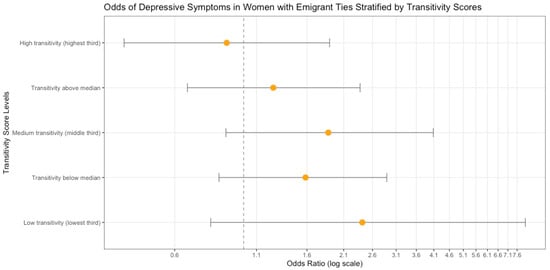 The odds of falling above the threshold for major depressive symptoms for females with emigrant ties (compared to those without emigrant ties), stratified by five levels of the transitivity score, with 95% confidence intervals.