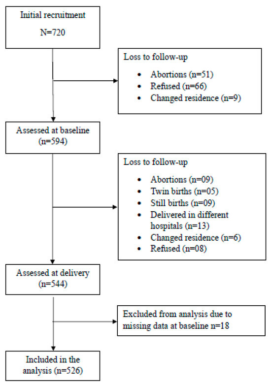 The following supporting information can be downloaded at: https://www.mdpi.com/article/10.3390/ijerph22091336/s1, Table S1. Comparison of socio-demographic profiles of participants assessed at baseline who had dropped out before delivery. Table S2. History of current pregnancy.
