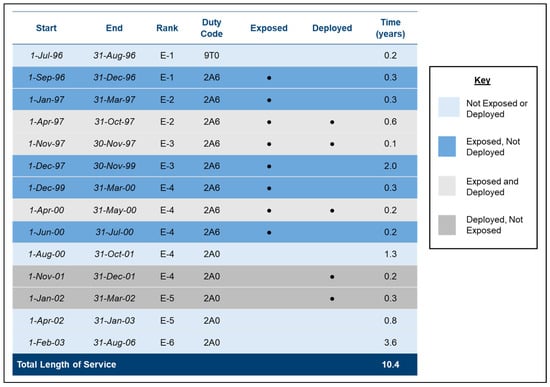 A hypothetical example of a jet fuel-exposed Air Force Veteran’s service history. Each line (or career segment) begins with a change in occupation, rank, or deployment status. The example Veteran had a total length of service of 10.4 years. Over the course of their Air Force career, they were promoted from Enlisted-1 (E1) to Enlisted-6 (E6). They spent 4 years in a jet fuel-exposed occupation (2A6, Aerospace Propulsion) and 6.4 years in unexposed occupations (9T0, Basic Enlisted Airman and 2A0, Avionics Test Station). The Veteran deployed three times, for a total of 1.4 years and spent 0.9 years concurrently deployed and in a fuel-exposed occupation. All these segments are included in the data for analysis.