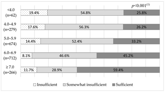 Figure 1 illustrates the association between total sleep duration per day across the five age groups and perceived sleep sufficiency. Short total sleep duration per day groups indicated higher percentages of perceived insufficient sleep, while longer total sleep duration per day indicated a higher percentage of perceived sufficient sleep (p < 0.001). However, there were notable individual differences. Among participants with <4 h of total sleep duration per day, 25.8% reported “sufficient sleep”; conversely, 11.7% of those with ≥7 h of total sleep reported “insufficient sleep”.