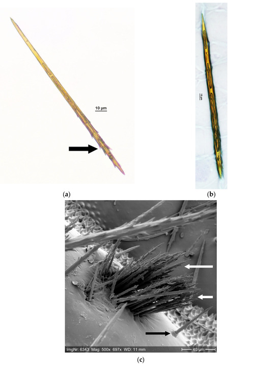 In processionary species, true setae are tubular but closed at both ends, and they are neither fixedly attached to the integument nor neurally connected [40,59] (Figure 1a,b). The setae have barbs at their distal end (Figure 1a,c) (e.g., [47,49,60,64,65,66]) and range in length from approximately 80 to 300 µm and in diameter from 3 to 11 µm [49,67]. The setae are formed on the dorsal side of the abdominal segments in integument areas called “mirrors” due to their light reflectivity (e.g., [40,47,58,63,64]) (Figure 1c–e). The basis of the mirrors is trichogen cells embedded in the epidermis [40] (Figure 1e). The setae of processionary species consist of a chitin cover and urticating proteins inside (e.g., [40,42,47,68,69,70,71,72,73]) (Figure 1a,b). To understand the functional roles of the setae components, an examination of the variability in the venom profiles in different life stages and under different environmental conditions is necessary [69].