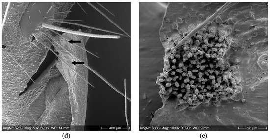 The SEM photos were taken with 50–1000× magnification on a ZEISS DSM 940A (CARL ZEISS AG, Oberkochen, Germany) equipped with a DISS5 unit (POINT ELECTRONIC GMBH, Halle, Germany) at the University of Freiburg, Chair of Forest Entomology and Forest Protection. The basic suitability of SEM photos for the determination of the number of OPM setae was proven in previous studies at the University of Freiburg. This method has been established by Ducombs et al. [60] and Lamy et al. [61] for PPM and for Ochrogaster lunifer by Perkins et al. [76].