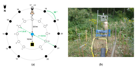 Experimental setup of the airborne setae exposure simulation with circular sampler arrangement and dummy. (a) Diagram (not true to scale): black square—blower, blue dot—setae source, white dots—large passive samplers in the inner circle (ID 1–11), black dots—large passive samplers in the outer circle (ID 12–22), grey dot—position of the active sampler (AS) and the small passive samplers, r—radius. (b) Photo (front to back): blower (black tube and yellow bail), setae source consisting of OPM tents in blue mesh bags, 2 circles of 11 passive samplers each on roof battens (samplers in the inner circle of samplers completely visible, outer circle partly displayed), dummy, active sampler on aluminum trestle and passive sampler; photo: Josef Pennerstorfer.