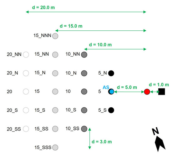 Experimental setup of the airborne setae exposure simulation with sampler arrangement in rows. d—distance: between the samplers and the setae source, between the individual samplers, between the blower and the setae source; black square—blower, red dot—setae source, blue dot—active sampler (AS); white, light grey, dark grey, black dots—passive samplers; diagram is not true to scale; for a photo of the experimental setup, see Supplementary Data 4.1.3, Figure S8C.