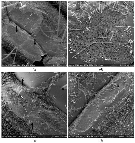 SEM photos of OPM mirrors from which the setae were mechanically detached. (a)—setae sockets (arrows) on the fore-mirrors of segment 10 (which is usually free of setae in the L5 instar) of an exceptionally large L5 larva from the field; (b)—dorso-lateral mirrors (arrows) of segment 11 of an exceptionally large L5 larva from the field; (c)—true hairs (arrows) within the mirror of segment 11 of an L5 larva; (d)—left fore-mirror with wide-spaced (mirror center) and close-set setae sockets (mirror edges) of segment 11 of an L5 larva; (e)—hind-mirrors of an L5 larva from the semi-field (small total size and small setae-carrying area with irregular edges, compared to Figure 4f), true hairs with collar at their base (arrows); (f)—hind-mirrors of segment 6 of an L5 larva from the field (large total size compared to Figure 4e; for geographic coordinates, see Supplementary Data 1, Table S1.