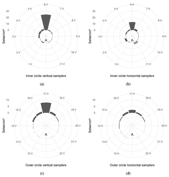 In general, higher vertical than horizontal setae deposition was observed in both the inner and the outer circle for those samplers standing in straight upwind direction, i.e., ID 6 and 17 (Figure 5).