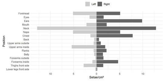 The analysis of the adhesive tapes on the dummy revealed an unequal setae distribution. The upper parts of the dummy, particularly the head, neck and nape, showed, on average, ca. threefold higher setae contamination than the rest of the body (Figure 6). Due to the positioning of the dummy in slight axial rotation to the air flow, the left ear caught less than 1% of the setae per cm2 than the right ear.