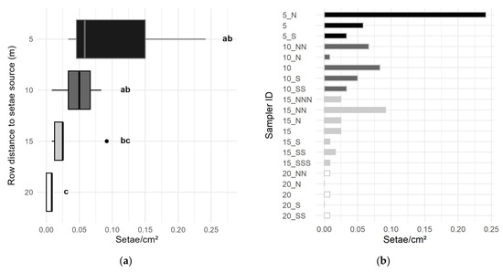 Number of setae per cm2 sampler, caught by large vertical passive samplers (size: 40 mm × 300 mm) in four rows at 5, 10, 15, and 20 m distance to the setae source in the setae exposure simulation. (a)—setae catch at the rows of samplers, statistical differences between 5 vs. 20 m and 10 vs. 20 m distance (indicated by compact letter display ab, bc and c; for statistics, see Supplementary Data 4.2.3); (b)—setae catch by the individual samplers at 5 m distance (ID 5_N, 5, 5_S), 10 m (from ID 10_NN to 10_SS), 15 m (from ID 15_NNN to 15_SSS) and 20 m distance (from ID 20_NN to 20_SS) to the setae source; N, S—sampler position in northward and southward deviation from the air flow of the blower, respectively.
