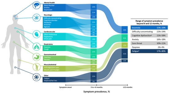 Prevalence, timing, and duration of commonly reported symptoms of long COVID at 3 to <6 months and ≥12 months (data in figure on left from Alkodaymi 2022, data for ranges of symptom prevalence beyond 6 and 12 months from Kim 2023 and Davis 2021) [22,23,24]. Where, a: Percentages for fatigue and cognitive dysfunction combine those from Kim 2023 and Davis 2021 and include symptom prevalence at 6–7 months (Davis 2021) and 12 and 24 months (Kim 2023) postacute COVID infection. All others are ranges at 12 and 24 months postacute COVID-19 infection (Kim 2023) [22,24].