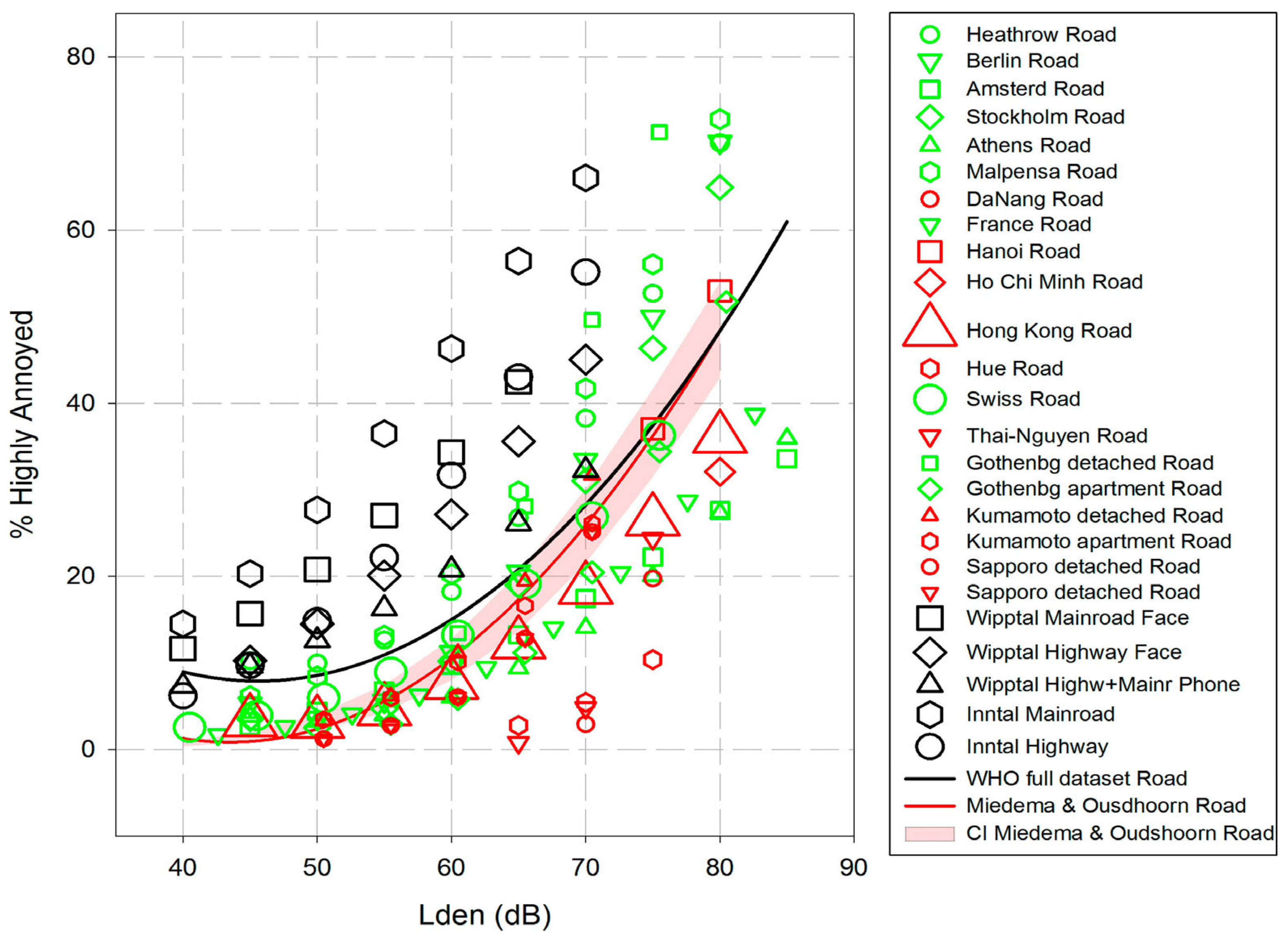 Lden road, whereas 10% HA for road traffic was obtained by 53 dB in the WHO curve. However, this seems to resemble a trend of German road traffic noise as the German curves represented in the meta-analysis exceeded other international studies and are also higher than the resulting average [