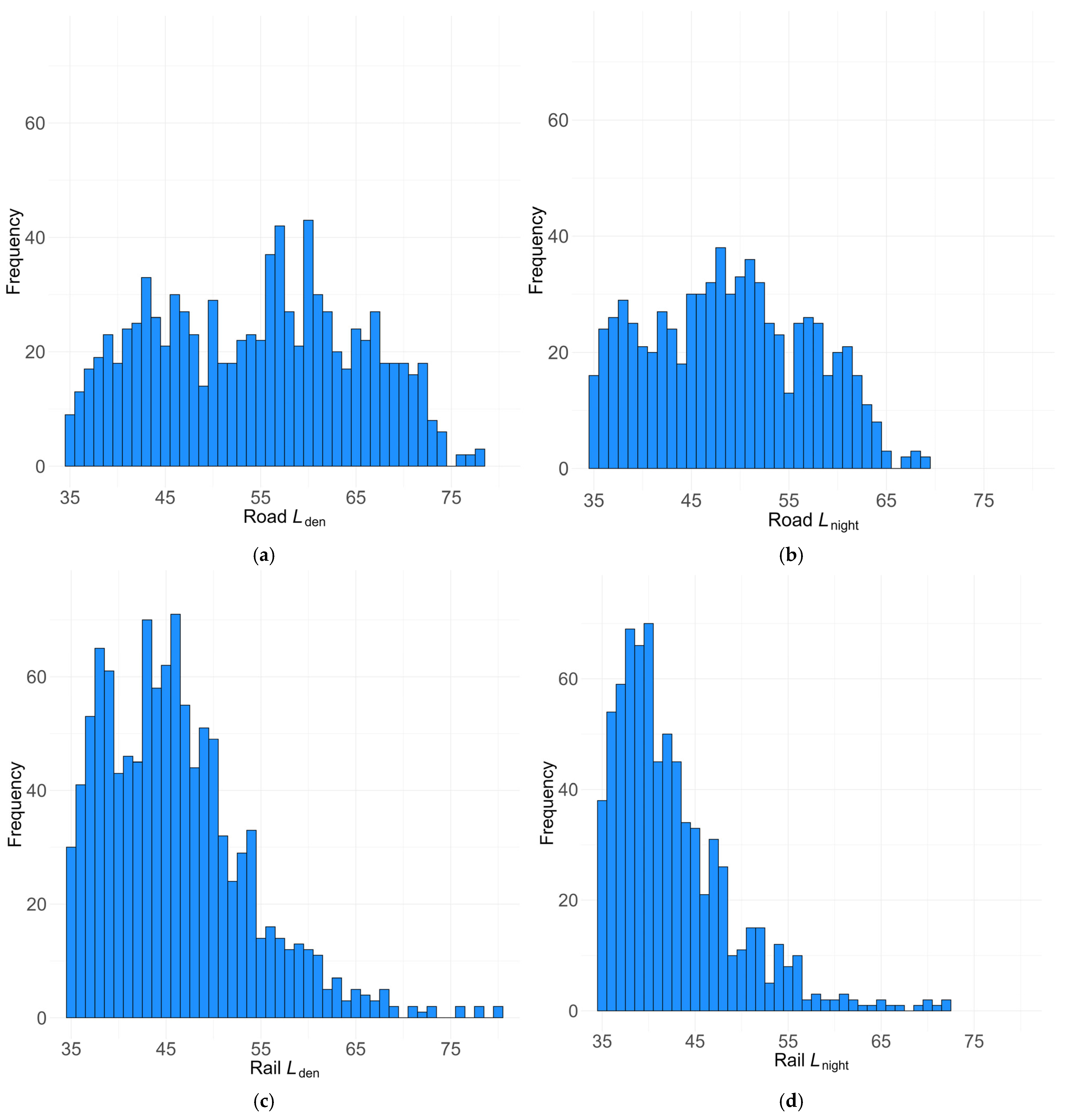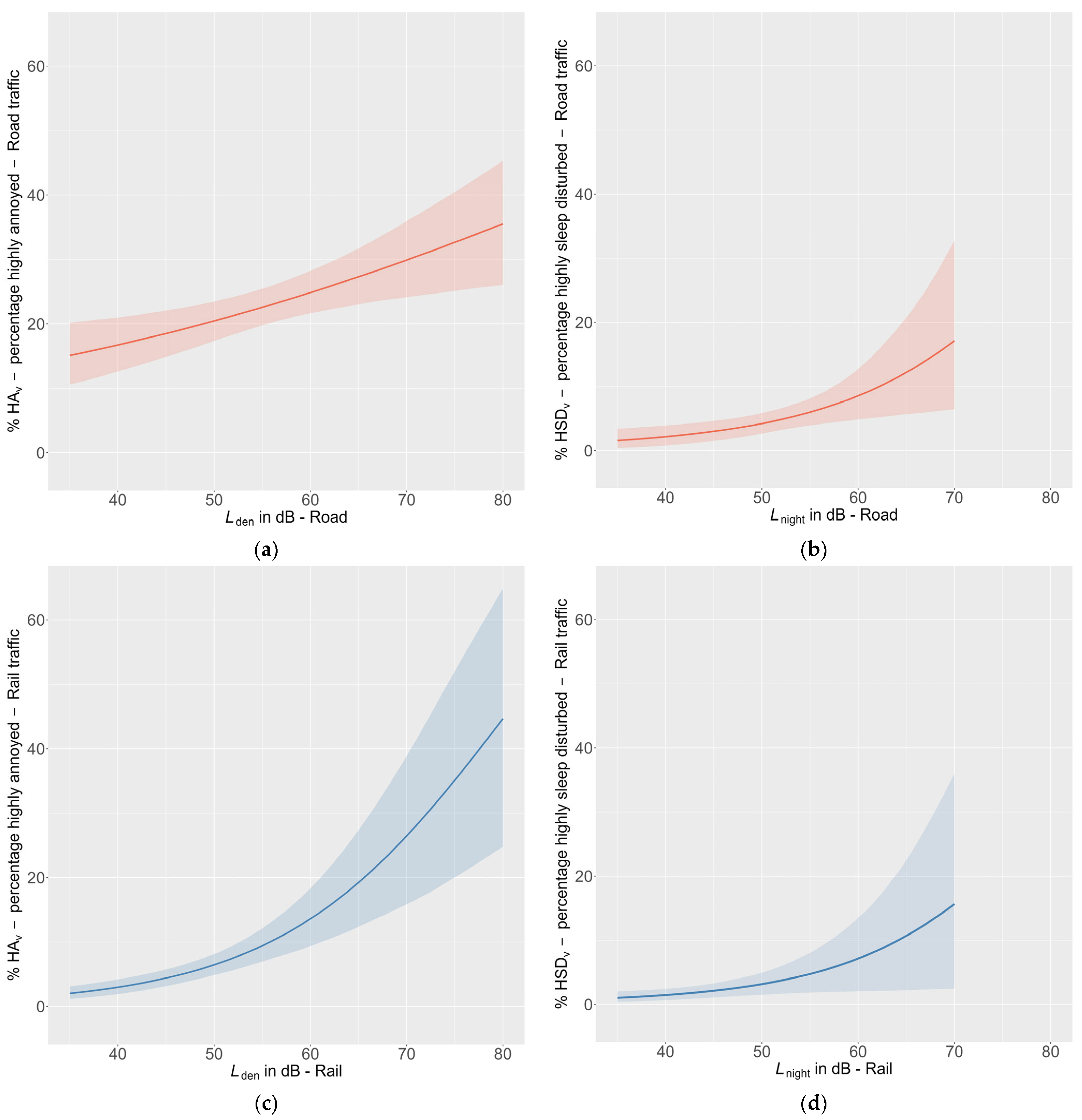 Additionally, the quality of noise exposure assessment relies heavily on the availability of noise data from local authorities, which was constrained for certain noise sources in some study areas. Therefore, future studies aiming to comprehensively assess the noise situation (i.e., exposure–response curves) should adopt sampling strategies that ensure sufficient numbers of participants across the full range of noise exposure levels.