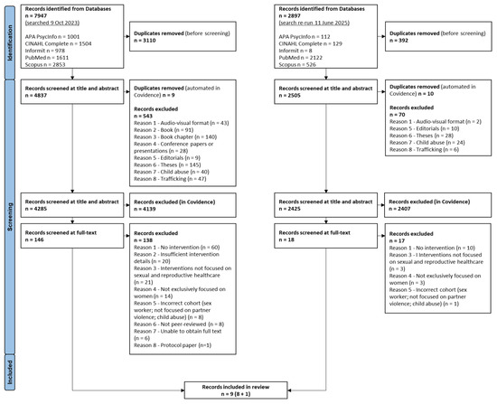 The five database searches on 9 October 2023 resulted in a total of 7947 records. Following screening, 146 records met eligibility for review at full-text level, of which 138 were excluded. The most common reasons for exclusion included, a lack of an intervention, insufficient detail about the intervention, interventions not focused on sexual and reproductive healthcare, studies not exclusively focused on women, incorrect population cohort, non-peer-reviewed sources, or protocol papers (Figure 1). Eight remaining records were included in the review. The repeated search on 11 June 2025 identified one additional paper to be included. A total of nine papers were included in the final analyses. See Figure 1 for studies included and excluded with rationale at each stage.