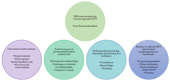 Given the broad and exploratory nature of this scoping review, and without specific a priori research questions, consistent with scoping review approaches, the findings are synthesised in relation to the emergent themes. These themes relate to SRH interventions provided to women who have experienced IPV surrounding barriers, facilitators, outcomes of interventions and positive impacts of interventions reported by survivors, which were identified through this review. Consistent with this approach, previous research has demonstrated the value in exploring barriers and facilitators as an early phase in growing an empirical literature base and to guide future rigour in intervention delivery and evaluation (see [52]).