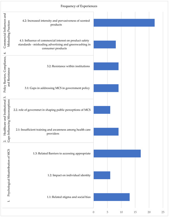 Figure 1 illustrates the frequency of shared experiences by participants corresponding to each theme and subtheme. In relation to theme 1, participants expressed the impact of misconceptions that perpetuate stigma and social bias regarding their condition as psychogenically misinterpreted. Subtheme 1.1, concerning stigma and social bias, was mentioned thirteen times. This subtheme consisted of experiences discussed by participants that involved facing dismissal when trying to educate others, as well as social bias that their physical symptoms from exposure to scented products were psychological. Subtheme 1.2, impact on individual identity, comprises six experiences mentioned by participants, involving a loss of their former selves and lives. They discuss having aspects of their life taken away from them or lost, such as their employment, friends, and family. As a consequence, multiple participants experience isolation and mental health impacts.