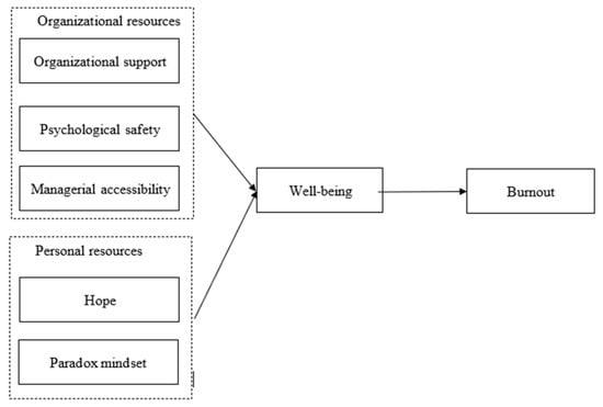 COR theory [] provides a framework for understanding the interplay between well-being, personal and organizational resources, and burnout. According to COR theory, the availability of resources plays a critical role in maintaining well-being and preventing resource depletion. Personal and organizational resources help to foster well-being, which acts as a buffer against stress and mitigates the risk of burnout. Conversely, a lack of resources initiates a resource-loss spiral, in which diminished well-being leads to further resource depletion and increased susceptibility to burnout []. Personal resources, such as hope and a paradox mindset, enhance well-being by equipping individuals with the psychological tools needed to manage stress effectively and maintain resilience [,]. Organizational resources, including perceived organizational support and psychological safety, play a complementary role by providing an environment that replenishes resources and reduces stress [,]. Together, these resources enhance employees’ psychological well-being, enabling them to cope with workplace demands more effectively and reducing the risk of burnout.