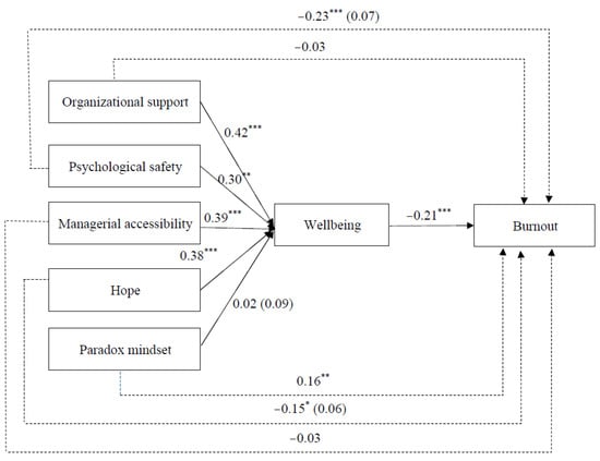 For the path analysis, we specified the relationship between organizational support, psychological safety, managerial accessibility, paradox mindset, hope, well-being, and burnout. Following Becker’s [] recommendation, we included only the control variable relationships that were significantly correlated with the dependent variables. To estimate the indirect effects, we utilized a bias-corrected bootstrap procedure [] with 10,000 replications. The model demonstrated an acceptable fit to the data (χ2 = 62.55; df = 32; p = 0.001; CFI = 0.95; TLI = 0.92; SRMR = 0.07; RMSEA = 0.06). As hypothesized, organizational resources variables were positively associated with well-being scores (β = 0.42, SE = 0.10, p < 0.001; β = 0.30, SE = 0.11, p = 0.004; β = 0.39, SE = 0.10, p < 0.001 for organizational support, psychological safety, and managerial accessibility, respectively) and well-being scores were negatively associated with employee burnout (β = −0.24, SE = 0.03, p < 0.001). The indirect relationships between the different organizational resources and burnout via well-being scores were significant [indirect effect = −0.09, SE = 0.03, 95% bias-corrected confidence interval BCCI (−0.16, −0.04) for organizational support; indirect effect = −0.07, SE= 0.03, 95% BCCI (−0.14, −0.02) for psychological safety; indirect effect = −0.08, SE= 0.03, 95% BCCI (−0.15, −0.04) for managerial accessibility], confirming Hypothesis 1a–c.