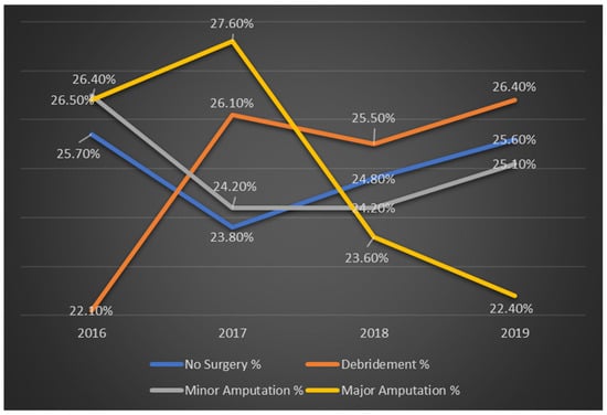 | Measure | No Surgery | Debridement | Minor Amputation | Major Amputation | p-Value |