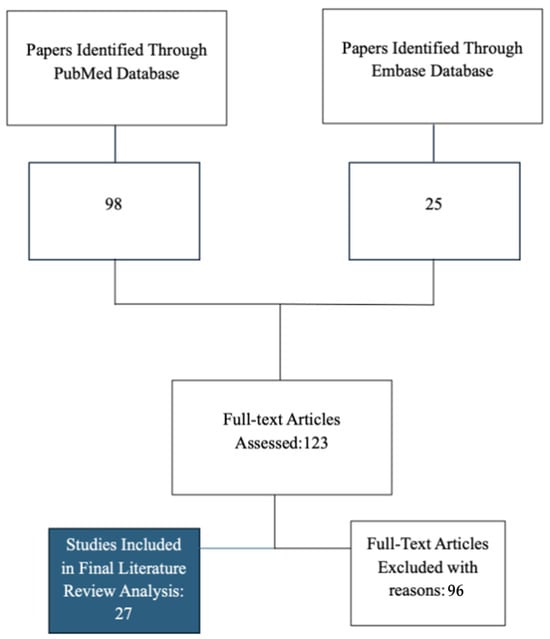 Flow diagram outlining the study selection process. A total of 123 records were identified through database searches (98 from PubMed and 25 from Embase). After screening and application of eligibility criteria, 27 studies were included in the final review. A total of 96 full-text articles were excluded based on the inclusion criteria.
