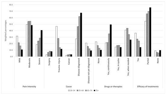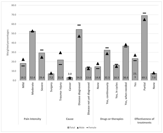 Figure 1 and Figure 2 illustrate CP characteristics by age and sex (the same data are also provided as a table in Supplementary Materials Table S2). As concerns CP intensity levels, the majority of CP-affected subjects suffer from moderate pain (52.4%). Severe pain affects 29.4% of CP-affected subjects, with a higher percentage among females (32.4% vs. 24.8%), showing an increasing trend by age.
