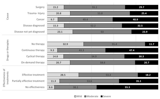 Figure 3 shows the CP intensity distribution in relation to the underlying CP causes or triggers. Cancer shows the highest frequency of severe/very severe CP (40.9%). This percentage decreases to 23.9% among those who do not yet know the cause or the trigger of the onset and persistence of their CP.